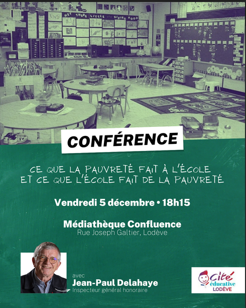 Nous avons le plaisir de vous inviter le VENDREDI 5 DECEMBRE à 18h15 à la Conférence "Populaire" qui sera donnée par M.Jean-Paul DELAHAYE, ancien Directeur Général de l'Enseignement Scolaire et Inspecteur Général honoraire sur le thème : "Ce que la pauvreté fait à l'école, ce que l'école fait de la pauvreté."